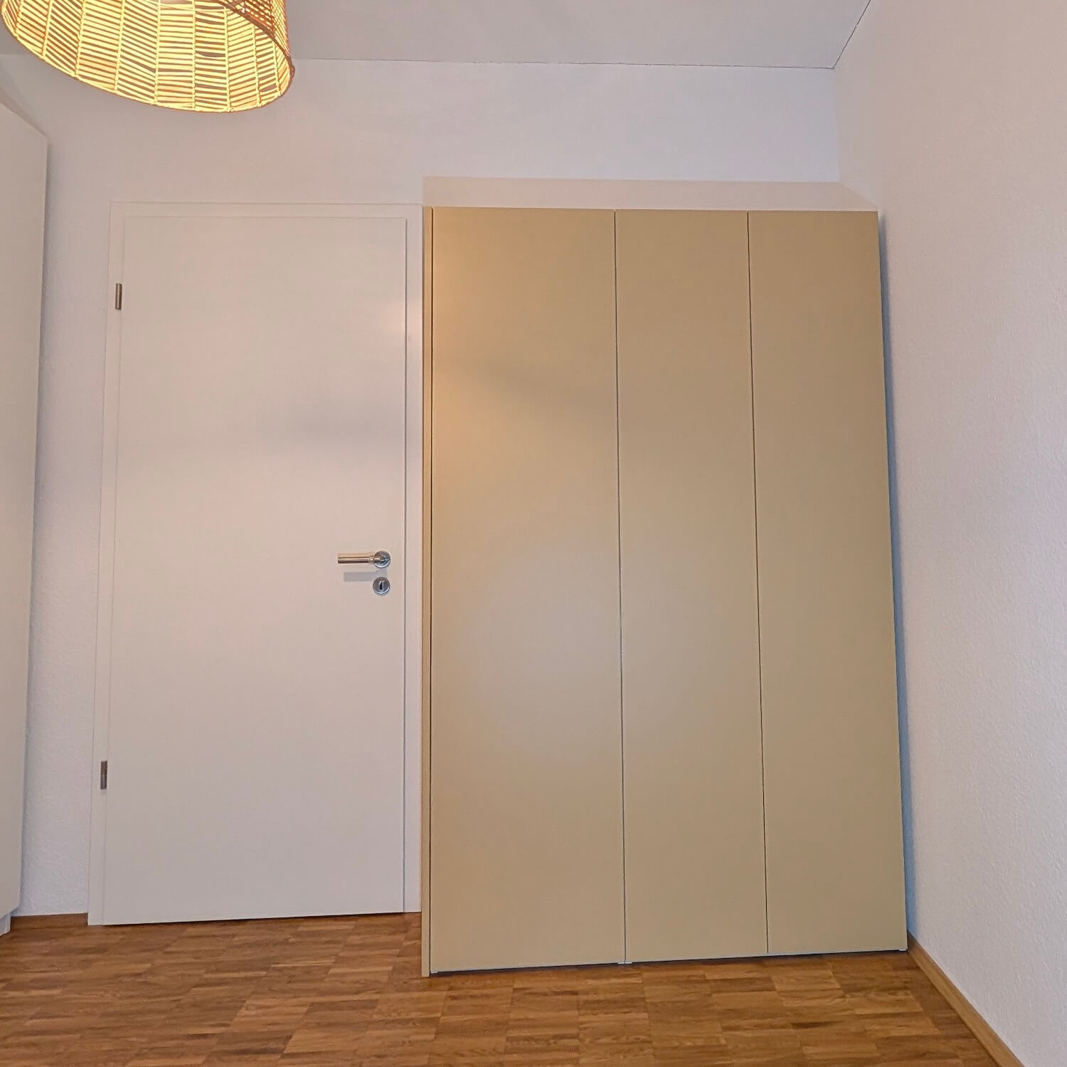 Wenn du deinen PAX Schrank optisch noch hochwertiger gestalten möchtest, kannst du raumhohe Türen verwenden und zusätzlich passende Seiten- und Frontblenden ergänzen. Dadurch wirkt der Schrank weniger wie ein freistehendes Möbelstück und bekommt eine deutlich ruhigere, integrierte Optik. Besonders in Nischen oder wandbündig aufgestellten Schränken entsteht so eine schöne Einbauoptik.